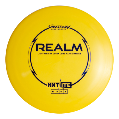 The Realm - NXT LITE is a yellow distance driver with black text, a circular design, and flight numbers 12, 5, -1, 3€”perfect for power throwers seeking durable plastic and maximum distance.